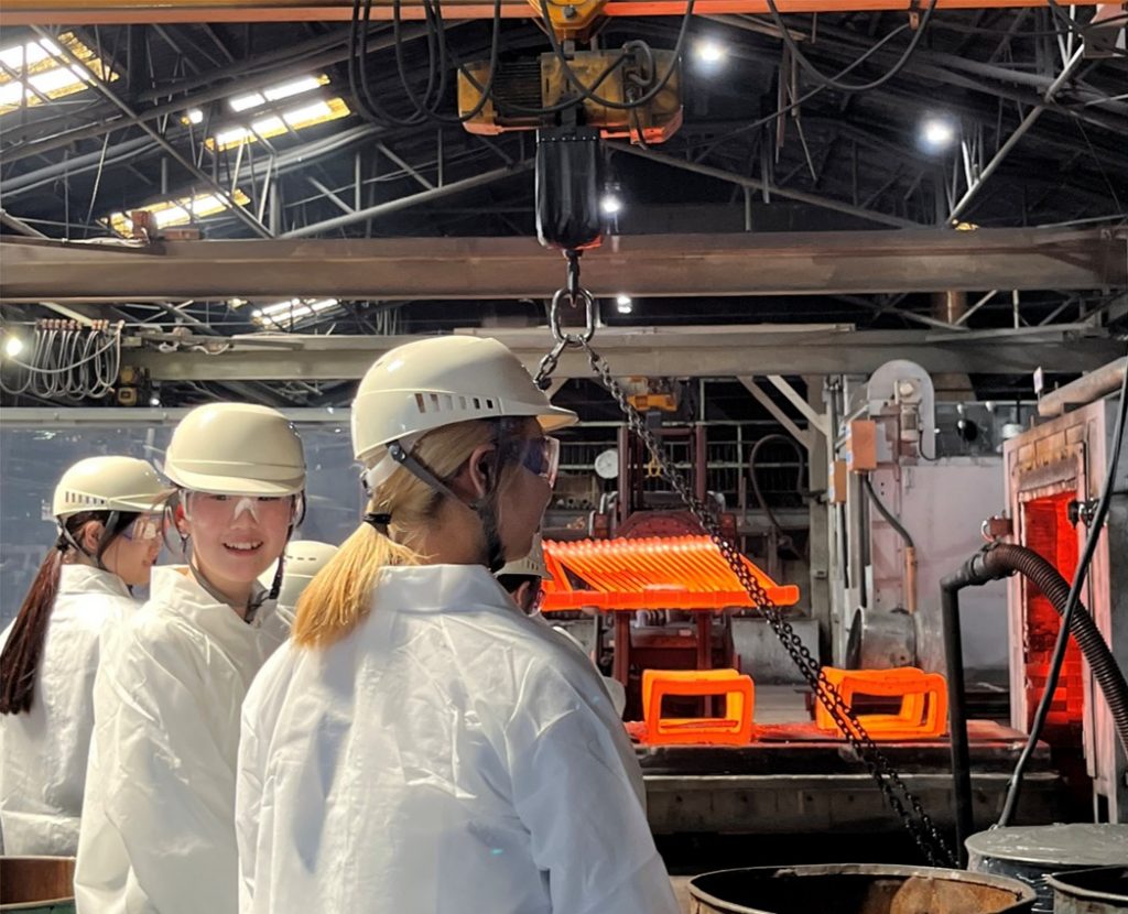 続いて、軍手に安全帽などを身に纏い、いざ特殊銅合金の製造現場へ潜入。(専門用語でプレスやハンマー等で金属を成型することを「鍛造」と言うそうです) 熱処理では約900~1000℃の高温に熱せられた銅を面前にし、その真っ赤に熱を帯びた銅を専用のフォークリフトを巧みに操りながら、テキパキとお仕事をされる社員の方々に、学生達は言葉を失っていました。熱処理炉から出てきたこの円板は半導体産業で使用されるものです。