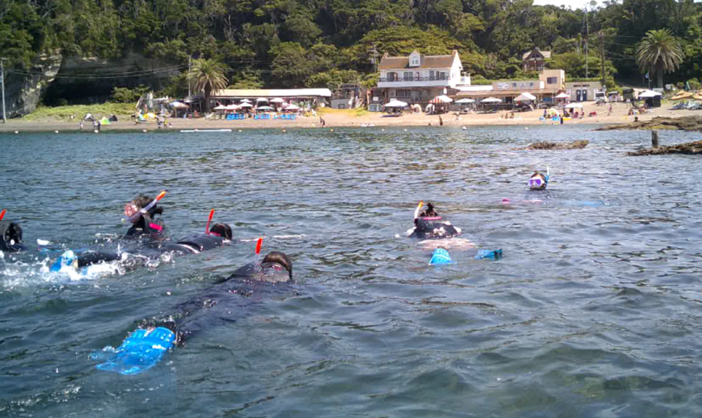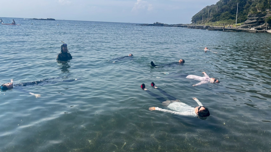 「三浦海の学校」の吉田インストラクターより、シュノーケリングについて学びました。シュノーケルクリア(シュノーケルの中に水が入ったときの排出方法)、マスククリア(マスクの中に水が入ったときの排出方法)、水中でのフィンキックの仕方など丁寧に教えていただき、30分ほどで、自由に泳げるようにまでなりました。海中散歩では、海中のコンディションも良く、様々な魚と出会うことができました。大きな鯛を見ることができ、普段の生活では感じることのできない体験となりました。
