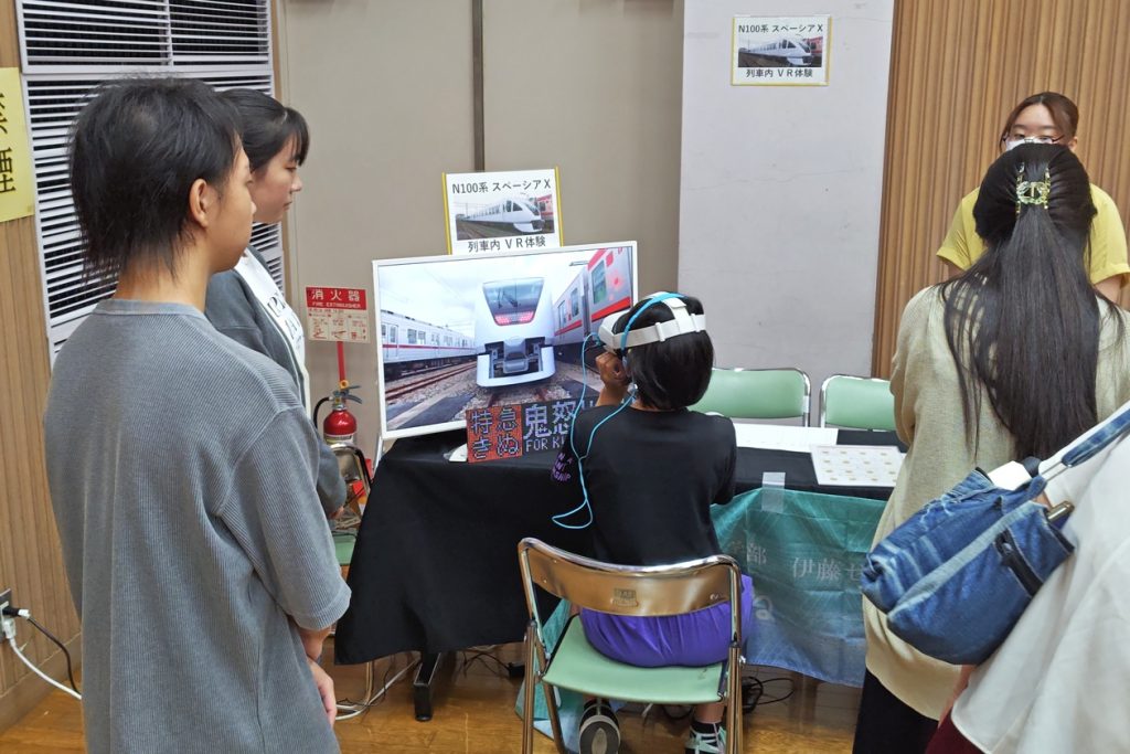 展示では、東武鉄道の新型特急車両N100系「スペーシアX」の車内をVRで体験できるプログラムを用意しました。今年は編成を先頭から最後尾まで歩き通す「車内歩き通し編」を制作し、来場者の皆さんにはまるで実際に列車内を探検するような臨場感を味わっていただきました。そのほかにも、手回し発電機を使って走らせる鉄道模型(Nゲージ)や、精巧なNゲージの展示走行を行い、子どもから大人まで幅広い世代に楽しんでいただきました。