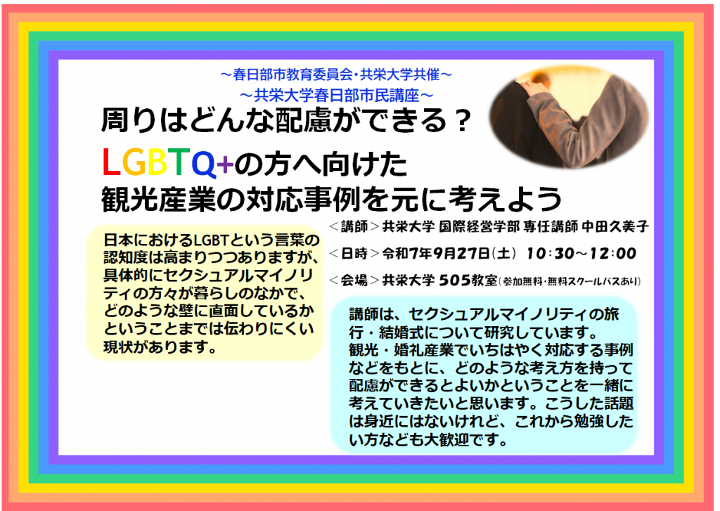 9月27日(土)、「周りはどんな配慮ができる? LGBTQ+の方へ向けた観光産業の対応事例を元に考えよう」と題した講座が共栄大学で開催されました。