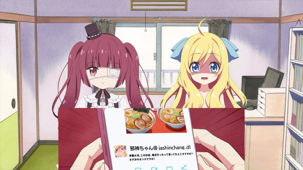 商店街とカフェの様子を別々のSNSに投稿した邪神ちゃん。投稿を組み合わせることで居場所が特定される危険を知り、リアルタイム投稿を避けるなど工夫の必要性を実感する。