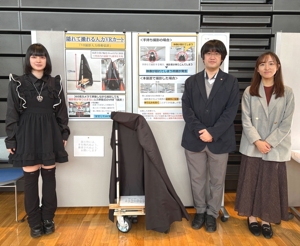 今回の出展にあたっては、塚原さんを指導する伊藤大河准教授のもと、伊藤ゼミの卒業生である本学の河合麗奈助教もサポートに加わりました。河合先生は、学生時代に開発した「腕木式転落防止装置」を本展覧会に出展した経験を持ち、その知見を活かして、ポスター制作や展示方法に関するアドバイスを中心に学生を指導しました。このように、卒業生が教員として後輩を支援する形での協働は、伊藤ゼミの学びの循環を象徴するものとなっています。