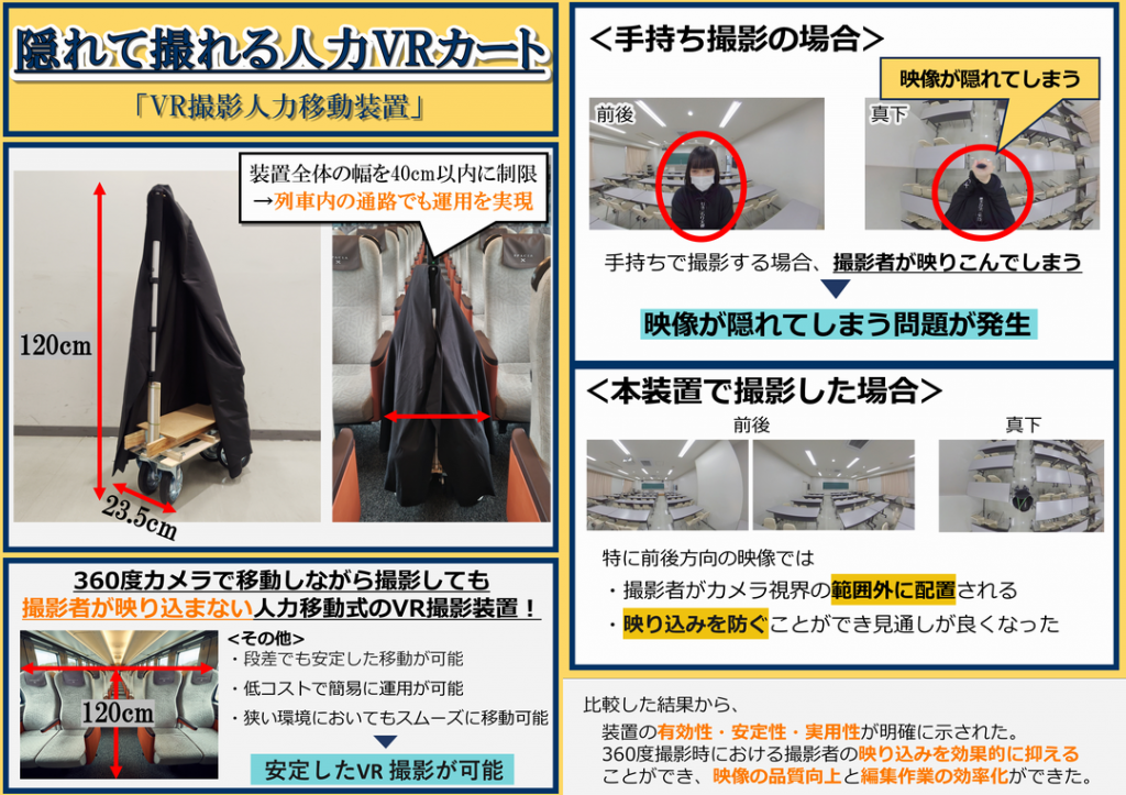 塚原さんは、課題の発見から構想、試作、改良に至るまで主体的に取り組み、その成果として特許庁に実用新案登録(登録済)を果たしました。装置は人力で移動させながらカメラを安定させる仕組みを備えており、揺れの少ない滑らかなVR映像を撮影することができます。