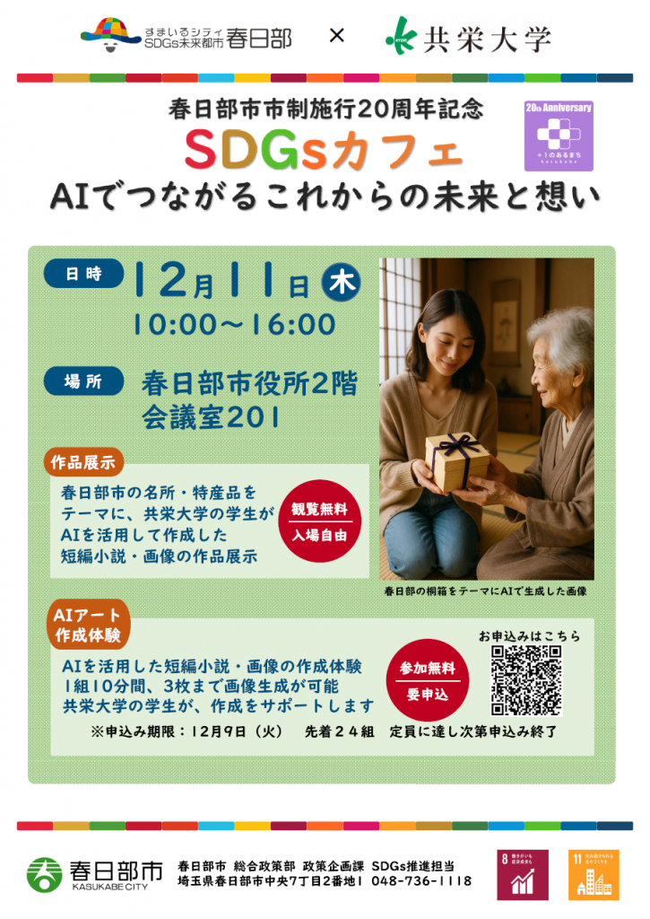 メディアやポップカルチャーを中心としたICT研究活動を展開する国際経営学部の伊藤ゼミ(指導教員:伊藤大河准教授)では、2025年12月11日(木)に春日部市役所2階会議室201にて「春日部市市制施行20周年記念 SDGsカフェ ~AIでつながるこれからの未来と想い~」を開催します。
