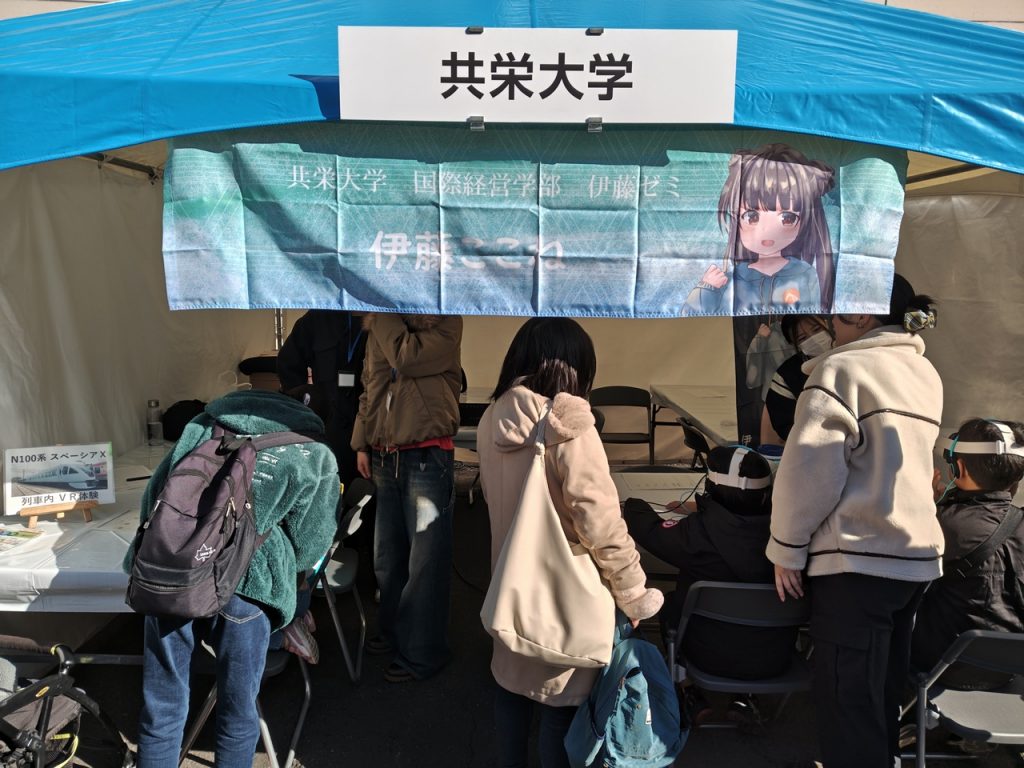 メディアやポップカルチャーを中心にICT研究活動を行う国際経営学部の伊藤ゼミ(指導教員:伊藤大河 准教授)は、2025年12月7日(日)に東武鉄道・南栗橋車両管区で開催された「2025 東武ファンフェスタ」に出展し、学生が制作した「スペーシアX車内のVR体験」を提供しました。本企画は、学生が課題発見から開発・撮影まで取り組んできた「隠れて撮れる人力VRカート」(実用新案登録名:VR撮影人力移動装置、開発代表者:国際経営学部4年・塚原沙紀さん)を用いて制作したVR映像を来場者に公開するもので、事前に発信したプレスリリースでも紹介してきた取り組みです(プレスリリース:https://www.u-presscenter.jp/article/post-58052.html)。