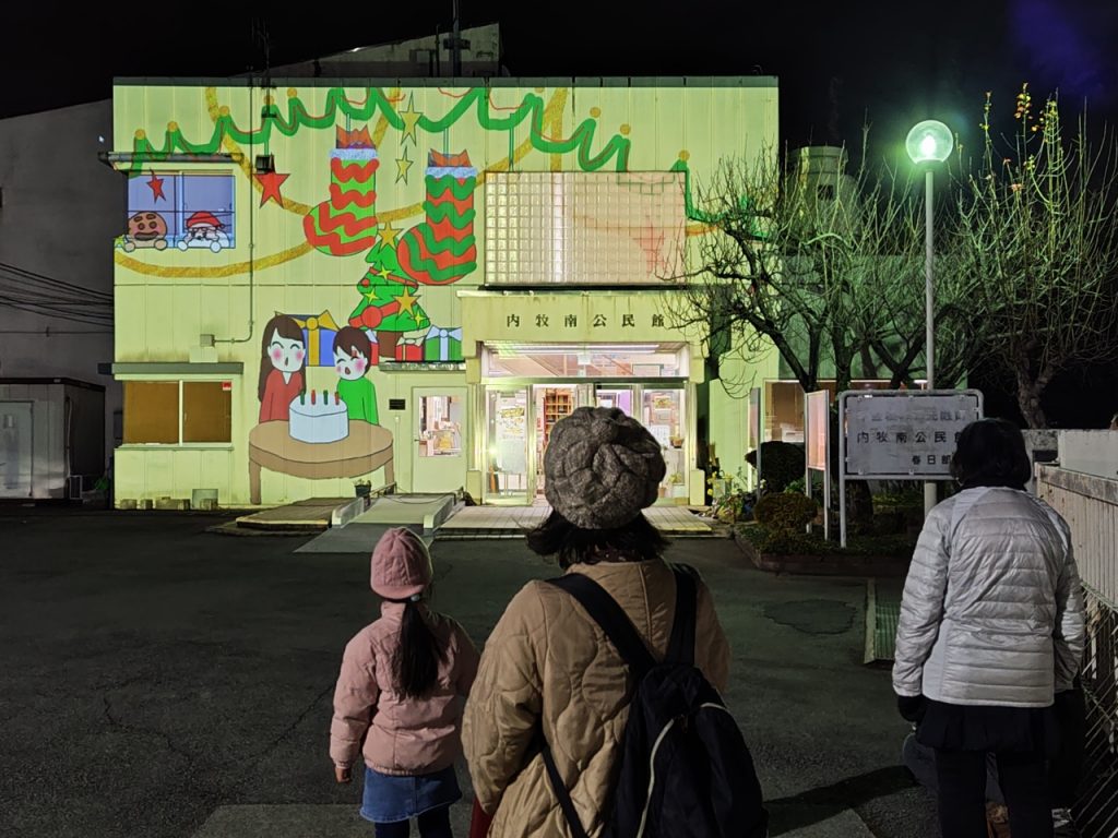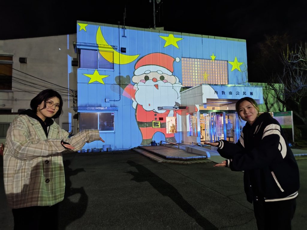 メディアやポップカルチャーを中心にICT研究活動を行う国際経営学部の伊藤ゼミ(指導教員:伊藤大河 准教授)は、2025年12月19日(金)・20日(土)の2日間、大学が所在する埼玉県春日部市内牧の内牧南公民館において、学生が制作したクリスマス・プロジェクションマッピングを実施しました。