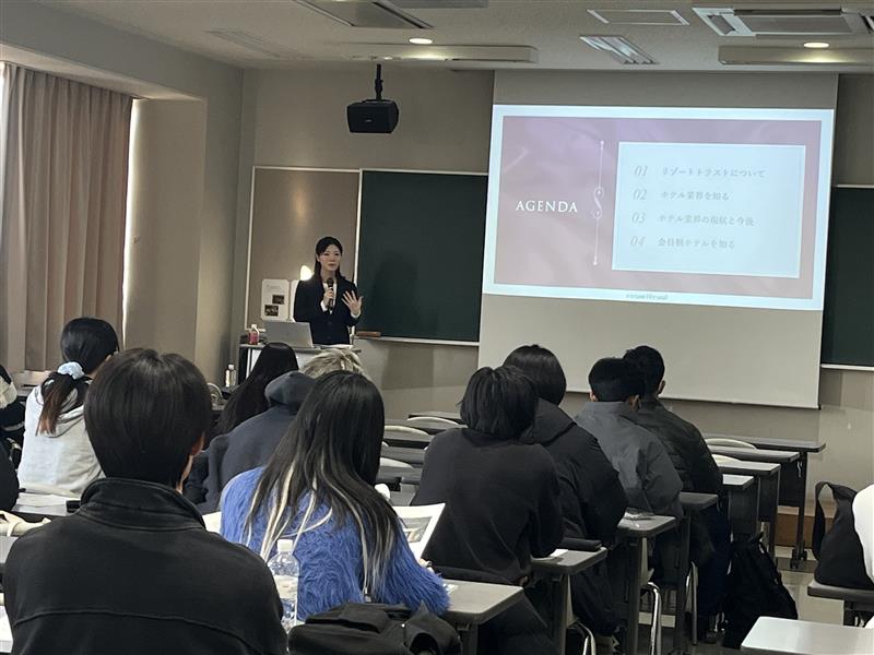 学生からの活発な質疑応答もあり、「同じお客様」が「何度もご利用になる」会員制リゾートホテルだからこそ、お客様の声に合わせて求められるサービスを生み出し、信頼関係のもとで、あらたなよりよいサービスが生まれていくという好循環のなかで好業績を上げ、事業拡大がなされているというビジネスモデルを知ったことは、宿泊以外のビジネスへの視点を拓く有意義な時間となりました。