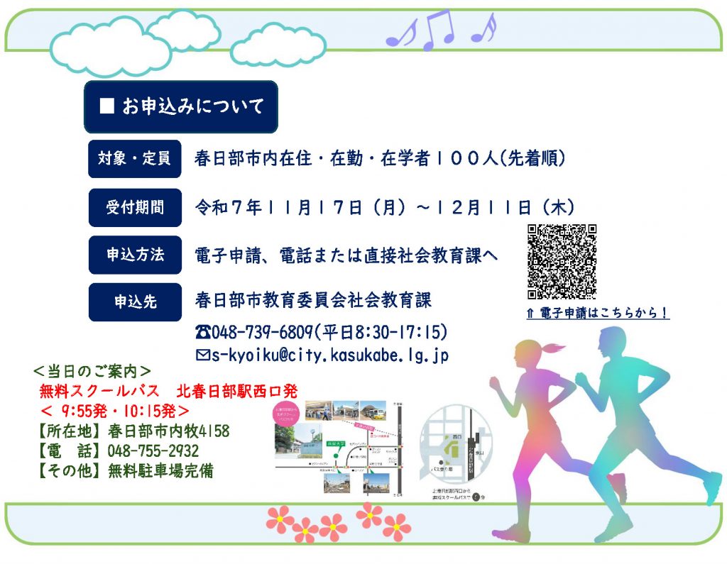 【申込開始】11/17(月)~12/11(木)【申込先】春日部市 社会教育課 社会教育担当 電子申請 電話(048-739-6807)または直接、社会教育課へ