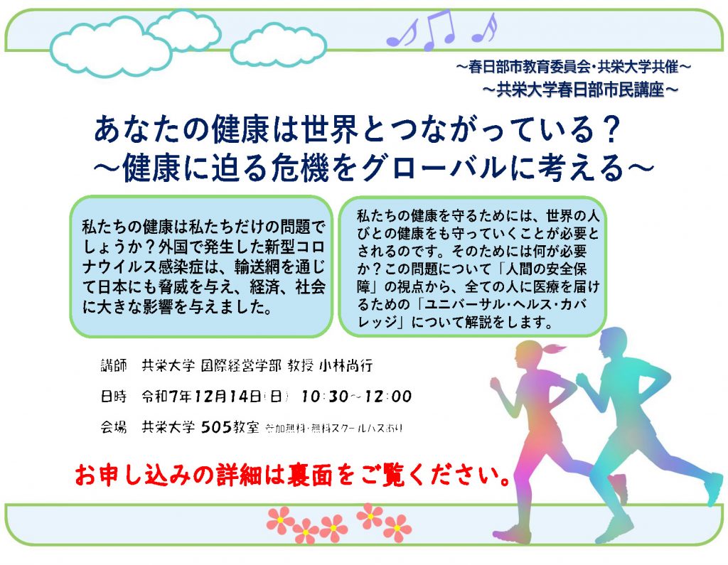日 時:12/14(日)10:30~12:00場 所:共栄大学 505教室テーマ:あなたの健康は世界とつながっている? ~健康に迫る危機をグローバルに考える~講 師:共栄大学 国際経営学部 教授 小林尚行