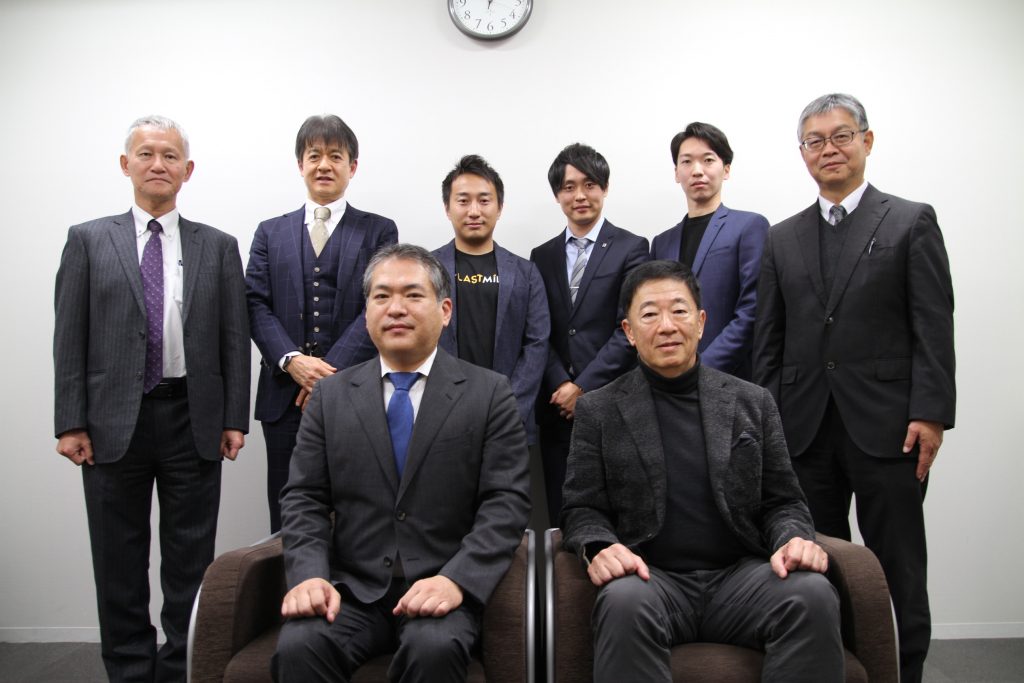 第1部_集合写真(左前方より 本学理事長 岡野、辻野氏、左後方より 春日部共栄中学高等学校 伊藤、本学学長 平林、小林氏、関氏、山口氏、春日部共栄中学高等学校 校長 加藤)